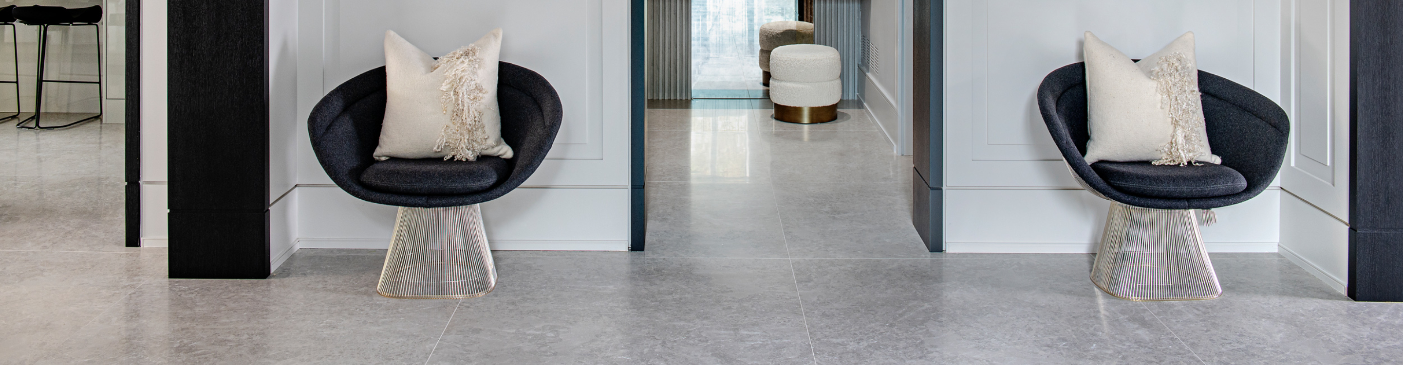 Ceramic tiles offer versatility and a wide range of colors and patterns, ideal for creating a unique living room atmosphere. Natural stone tiles, such as marble, granite, and slate, bring a touch of elegance and luxury, each piece unique in its veining and texture, perfect for a sophisticated living room setting. Each type of natural stone has different attributes so be sure to talk to our experts to understand what types of stone are ideal for your space.
